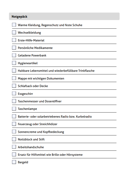 - Legen Sie einen Notvorrat (Wasser, Lebensmittel, Medikamente) für mindestens drei bis zehn Tage an.